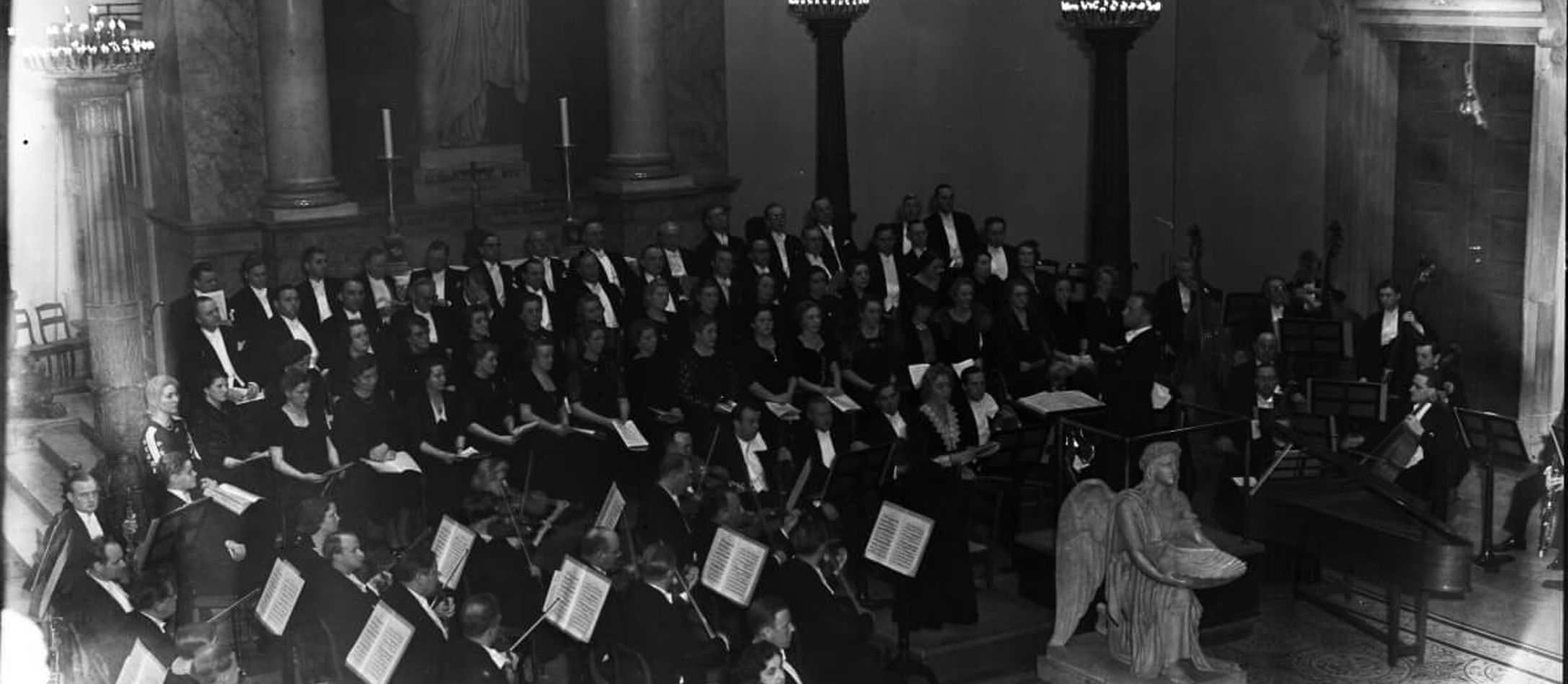 Et enestående fotografi fra anden halvdel af 1930’erne. Det er taget ved en sjælden barokkoncert i Københavns Domkirke, nemlig en opførelse af Händels Messias. Dirigenten er den unge barokekspert Mogens Wöldike, og blandt solisterne ser man tenoren Aksel Schiøtz. Efter datidens norm er det en meget stilbevidst opførelse. Der medvirker f.eks. et cembalo i orkestret, formodentlig spillet af den tyske cembalist Liselotte Selbiger, der var flygtet fra nazisterne til Danmark.