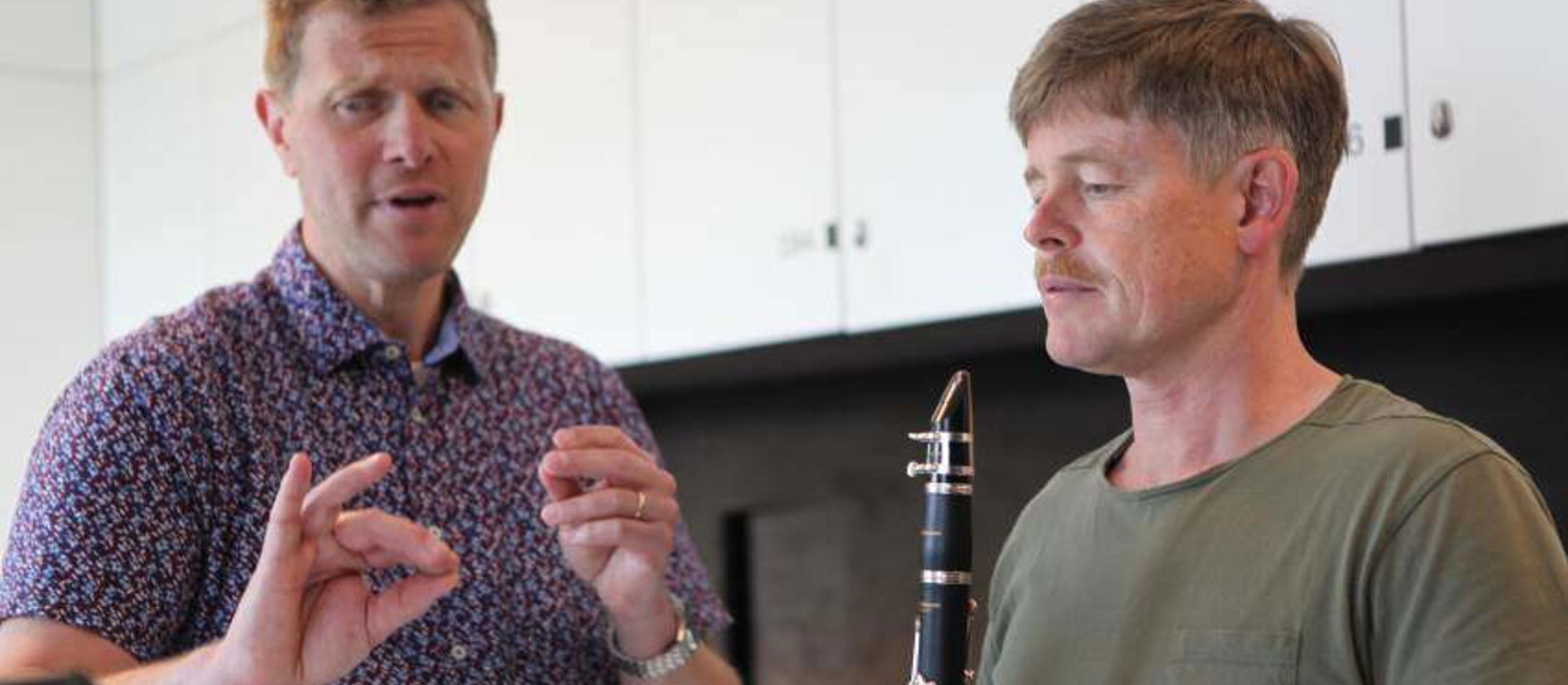 De to hovedpersoner i DR1’s komediedrama ’Orkestret’ sidder side om side på deres orkesterpladser, mens dramaerne udspiller sig. Men i virkeligheden er rollerne tæt på at være omvendt: Caspar Phillipson, som spiller førsteklarinettisten, har aldrig spillet klarinet i sit liv, mens Frederik Cilius, som spiller andenklarinettisten, faktisk er uddannet som klassisk klarinettist.