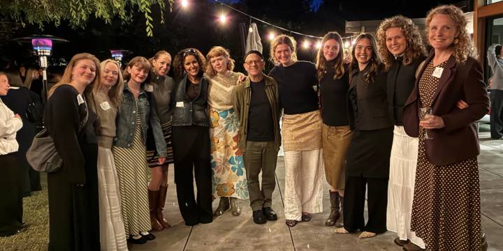 Undervejs på turnéen blev der blandt andet tid til et besøg hos Det Danske GGeneralkonsulat i Silicon Valley, hvor generalkonsul Jacob Vind var vært ved et uformelt netværksarrangement. Her ses et udvalg af korets sangere sammen med komponisten David Lang (i midten) og DR Pigekorets kunstneriske leder Anne Karine Prip (til højre).