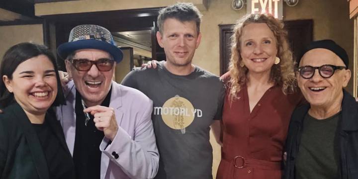 Efter koncerten i Carnegie Hall var der tid til hygge på bagscenen, hvor blandt andre sangeren Elvis Costello var mødt op for at lykønske koret. I midten ses lys- og lydtekniker Julian Falck og til højre komponisten David Lang.